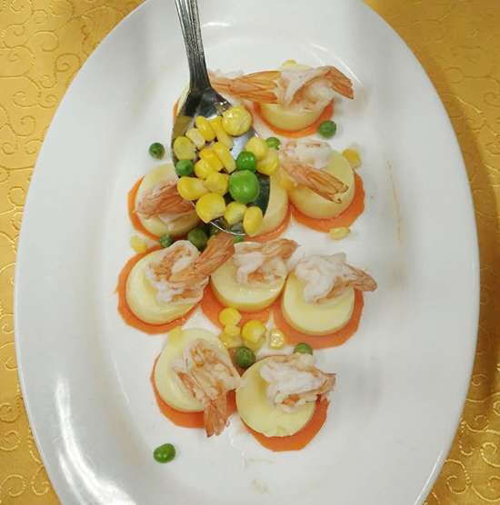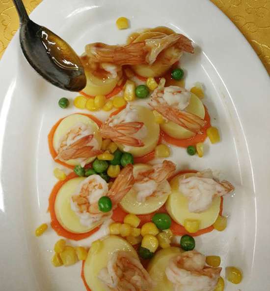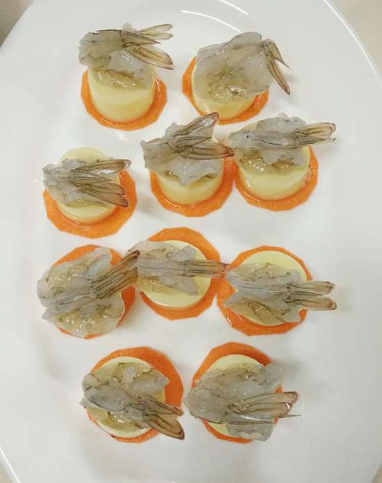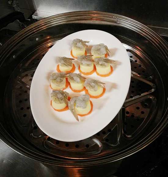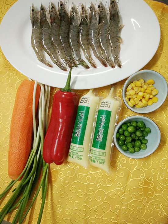 蝦,玉子豆腐,胡蘿卜,小蔥,紅辣椒,青豆粒,玉米粒,蒸魚豉油,雞精,糖,白胡椒粉,淀粉。