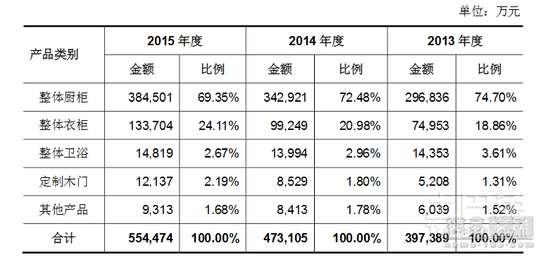領(lǐng)域的“另一個”歐派家居在業(yè)務(wù)上有著相同的走勢。從歐派家居公開的招股說明書上,2013—2015年度,其整體廚柜、整體衣柜業(yè)務(wù)是整體營收的核心組成部分。