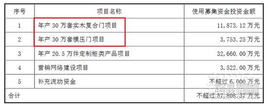根據(jù)公告,本次江山歐派門業(yè)公開發(fā)行股票總數(shù)不超過2021萬股,且不低于本次發(fā)行后公司股份總數(shù)的25%。通過招股說明書可以看到,本次江山歐派門業(yè)擬募集資金不超過5.78億元,投資項目主要用于擴(kuò)大木門產(chǎn)能,將用于“年產(chǎn)30萬套實木復(fù)合門”、“年產(chǎn)30萬套模壓門”、“年產(chǎn)20.5萬件定制柜類產(chǎn)品”、“營銷網(wǎng)絡(luò)建設(shè)”、“補(bǔ)交流動資金”等項目。