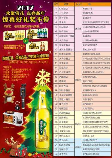 雪花禮約雙旦,醉爽驚喜好禮,為回饋煙臺(tái)市民多年來對(duì)雪花啤酒的支持,主辦方將在圣誕及元旦期間推出“歡聚雪花,點(diǎn)亮新年,驚喜好禮獎(jiǎng)不停”有獎(jiǎng)促銷活動(dòng)。即在活動(dòng)期間內(nèi),在指定的餐飲店消費(fèi)一定量的雪花啤酒,就有機(jī)會(huì)贏取康佳多功能電烤箱、圣誕玩偶,無線藍(lán)牙自拍桿等精美禮品!活動(dòng)時(shí)間將從12月23日持續(xù)到12月31日,共分三波開展,預(yù)計(jì)全煙臺(tái)市約80家美食名店參與本次活動(dòng),屆時(shí)將為煙臺(tái)市民帶來一場(chǎng)別樣的美食狂歡趴。