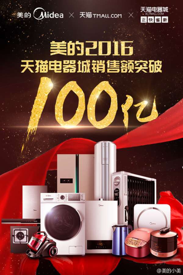 而2016年12月28日,美的集團發布電商年度“成績單”——2016全年在天貓單渠道銷售額突破100億,成為家電行業史上一個重要里程碑,也是天貓首個年銷售額破百億的家電品牌。美的2016上半年線上銷售總量超100億,而天貓年度單渠道已破百億,據推測天貓在已在所有電商渠道中位列第一。