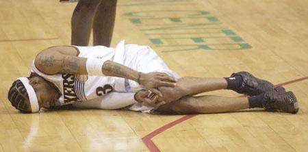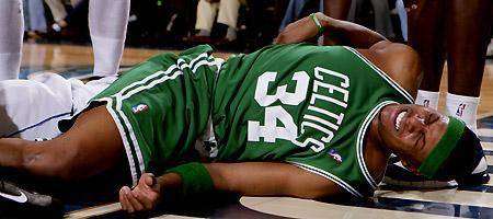 2008年6月6日,凱爾特人主場以98-88拿下湖人并贏得總決賽的首戰(zhàn)。第三節(jié)皮爾斯下落地過程中不慎于隊(duì)友帕金斯相撞,當(dāng)即痛苦倒地不起!而從隊(duì)友將他架出去,以及球員通道里被抬上小型機(jī)動(dòng)車的情形來看,皮爾斯似乎無論如何都打不了這場比賽了。讓人吃驚的一幕很快發(fā)生,僅僅只休息了三分鐘,皮爾斯就生龍活虎地回到球場。雖然膝蓋上戴了一個(gè)護(hù)膝,但臉上卻不見痛苦之色。他全場10投7中,罰球7罰5中拿下22分。