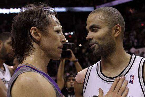 2010年西部半決賽第四場,太陽隊(duì)眼看就要橫掃馬刺。結(jié)果納什遭遇黑手右眼角嚴(yán)重受傷,不過經(jīng)歷短暫治療之后他就回到了場上橫掃了馬刺。