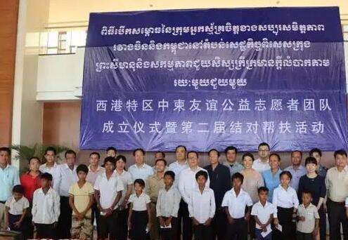 今年3月30日,西港特區中柬友誼公益志愿者團隊成立儀式暨第二屆愛心結對幫扶活動在西港特區順利舉行。西港特區中柬友誼公益志愿者團隊的建立,有效壯大了志愿者隊伍,拉動更多的人投身公益事業中,擴大了公益影響力。去年5月,西港特區公司在毗鄰特區的默德朗鄉小學舉辦了愛心結對幫扶活動,西港特區公司13位員工與默德朗鄉小學13名貧困學生結成“一對一”幫扶對子,資助這些學生直至小學畢業。今年,這些員工在去年的基礎上,繼續予以資助。成立儀式上,員工代表們還向這些貧困學生送上了愛心文具。