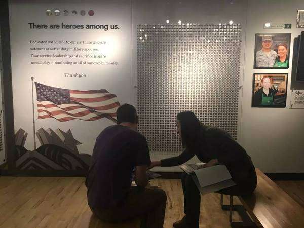 星巴克對(duì)美國軍人的敬重也體現(xiàn)在了宣傳墻上