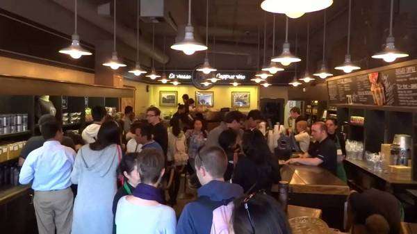 第一家星巴克總是人滿為患,門口常有街頭藝人在表演。
