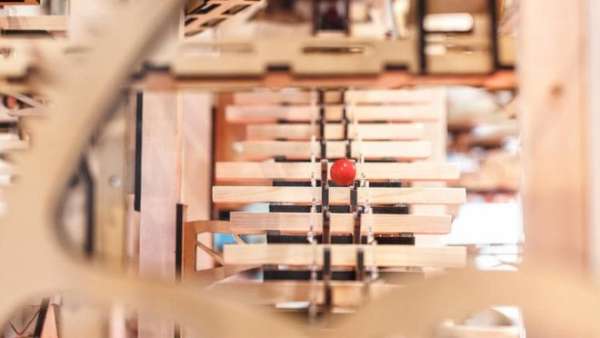 于是,在你等待一杯咖啡的時(shí)間里,會看到這個(gè)音樂裝置上的一個(gè)紅色的小球,沿著木制的音階一路滾落,期間奏出悅耳的音符。直到小球觸發(fā)紅色的“杯子”,意味著演奏告一段落,你的咖啡也就好了。