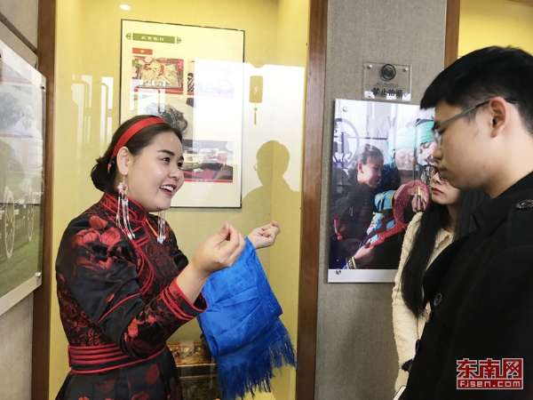 據(jù)內(nèi)蒙古鄂爾多斯博物館宣教部講解員塔娜介紹,《八百年不熄的神燈——祭祀成吉思汗的鄂爾多斯蒙古族歷史文化展》已經(jīng)在云南、廣東、貴州、山東、陜西等地展出。塔娜說,“福建是全國(guó)第十一站展出地點(diǎn),展覽接地氣,能夠生動(dòng)還原鄂爾多斯蒙古族人民的生活。”在她看來,由于鄂爾多斯蒙古族為游牧民族,對(duì)于福建人民而言,本次展出的服飾會(huì)較受歡迎。