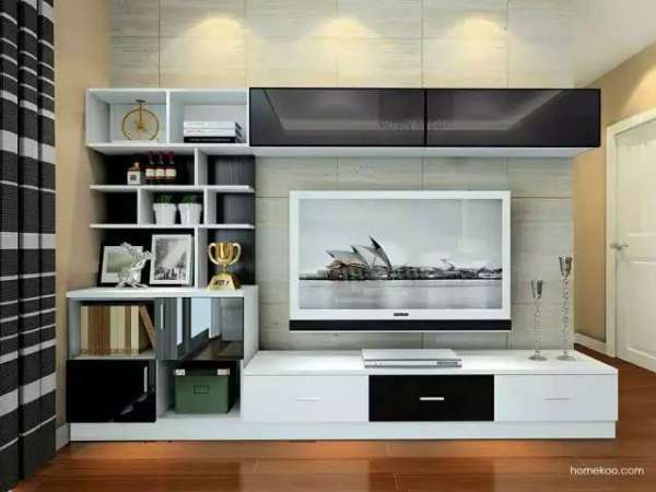 不喜歡復雜設計的,可以嘗試簡單的黑白搭配,左邊不規(guī)則分柜設計增添客廳亮點。