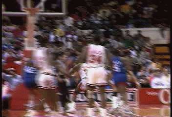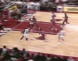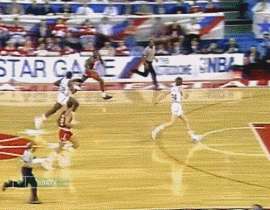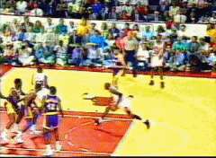 罰球線前一步空中換手拉桿,同樣天賦驚人的麥蒂曾經模仿過這一球,但是自己感嘆無法做到喬丹這樣的境界