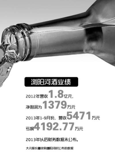 于是,在繼續(xù)尋求IPO的道路上,瀏陽河酒業(yè)依舊將目光投向了A股的上市公司,希望借殼上市。2013年11月,主營(yíng)業(yè)務(wù)與白酒業(yè)務(wù)毫無關(guān)聯(lián)的大元股份宣布擬收購(gòu)瀏陽河酒業(yè)100%股權(quán)。2014年1月,大元股份的一條公告也將瀏陽河一直藏著掖著的家底公之于眾:2012年瀏陽河酒業(yè)營(yíng)業(yè)收入僅1.8億元,凈利潤(rùn)為1379萬元;而2013年1-9月份,其營(yíng)收僅5471萬元,虧損達(dá)到4192.77萬元。