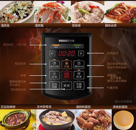 POVOS奔騰這款型號(hào)為L(zhǎng)N5151的電壓力鍋,5L容量,基本滿足一般家庭使用需求,功率為900W,一鍋雙膽,2mm不粘涂層內(nèi)膽,24小時(shí)預(yù)約,液晶顯示,特有營(yíng)養(yǎng)蒸,6段營(yíng)養(yǎng)烹飪程序,旋風(fēng)彈簧專利結(jié)構(gòu),鍋體不易變形,保壓更長(zhǎng)久。