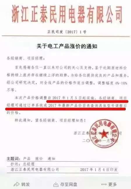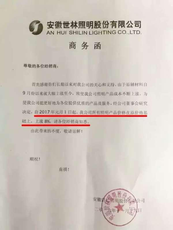 同樣自2017年元月1日起漲價的,還有歐普、正泰、世林照明等成品企業(yè)。從價格調(diào)整通知單可以看出,此輪漲價多是企業(yè)無法承受上游的漲價幅度,不得不做出調(diào)整。