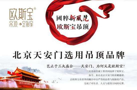 吊頂是一個的關注度產(chǎn)品,卻為建筑默默增色。歐斯寶20年來,進駐了上千個標志性工程,包括2008年北京奧運會、2010年上海世博會、2010年廣州亞運會等工程項目,剛過去的2015年,歐斯寶成為了世界反法西斯戰(zhàn)爭勝利70周年閱兵儀式的北京天安門選用吊頂品牌;在家裝方面,首次與國家級單位舉辦了首屆“歐斯寶杯”吊頂產(chǎn)品原創(chuàng)設計大賽”,在全國掀起新一輪家居吊頂藝術與風格美學相融的設計風潮。