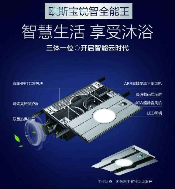 三款智能三合一產(chǎn)品,智沐暖風(fēng)寶、智炫暖浴王、銳智全能王,集照明、換氣、風(fēng)暖一體化設(shè)計(jì),智能檢測(cè)溫度,強(qiáng)效制熱模式,超靜音滾珠軸承電機(jī),超大LED照明光源,集成照明,環(huán)保更節(jié)能;其中“銳智全能王”以科技感十足的中東科技大樓為設(shè)計(jì)理念,當(dāng)智能一體化運(yùn)作時(shí),智能面板則會(huì)自動(dòng)向兩側(cè)滑開(kāi),智能顯示當(dāng)前照明、換氣、取暖等工作狀態(tài),超先進(jìn)的智能控制屏,無(wú)需任何接線處理,高檔金屬拉絲等先進(jìn)環(huán)保面板,科技感爆棚。