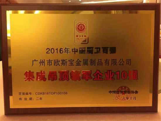 歐斯寶獲得集成吊頂領(lǐng)軍企業(yè)10強(qiáng)