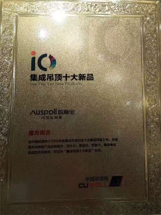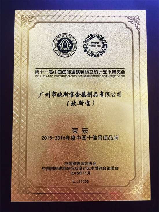 由中國(guó)國(guó)際建筑裝飾及設(shè)計(jì)藝術(shù)博覽會(huì)評(píng)選的“2015-2016年度中國(guó)十佳吊頂品牌”,充分見(jiàn)證了歐斯寶品牌獲得的權(quán)威認(rèn)可。