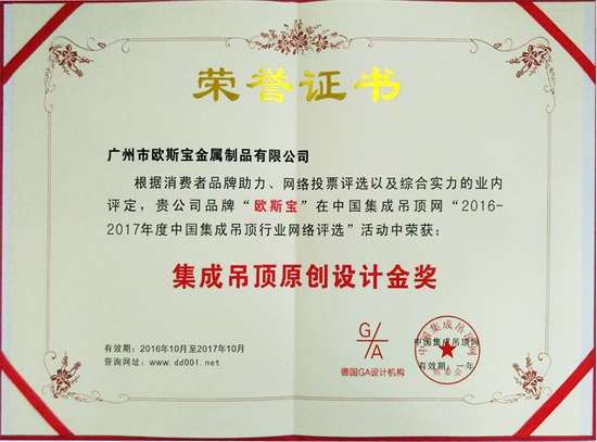集成吊頂原創(chuàng)設(shè)計(jì)金獎(jiǎng)證書(shū)