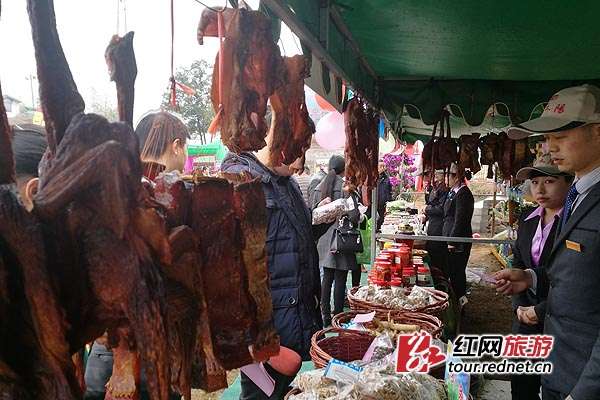 生活中最常見(jiàn)的時(shí)令蔬菜、當(dāng)季水果、熏制臘肉等美食現(xiàn)場(chǎng)展出。