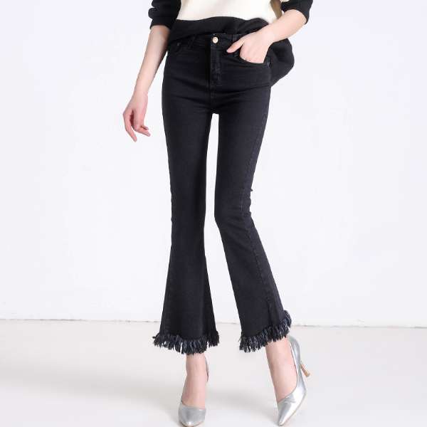 黑色高腰緊身牛仔喇叭褲女九分褲韓國秋冬顯瘦流蘇毛毛邊微喇叭褲