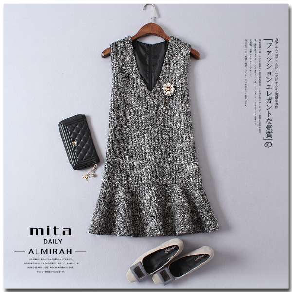 迷她歐美2016秋冬新款女裝V領(lǐng)荷葉擺毛呢?zé)o袖背心裙A字顯瘦連衣裙