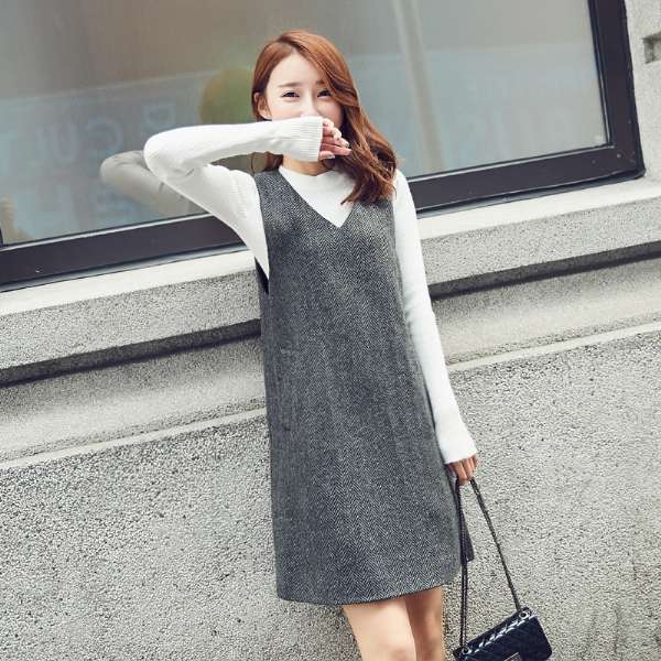 毛呢馬甲裙 2016秋冬款a字寬松大碼打底背心裙學(xué)院休閑無袖連衣裙