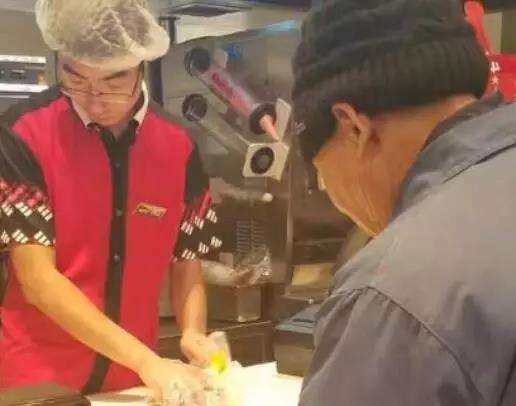 原來(lái),前一天晚上,王先生下班后,到位于杭州湖墅南路的肯德基紅石餐廳就餐,走進(jìn)餐廳看到,柜臺(tái)前的小伙子正在認(rèn)真地幫一位老大爺清點(diǎn)硬幣,然后把兌換好的兩張百元紙幣交到大爺手中。