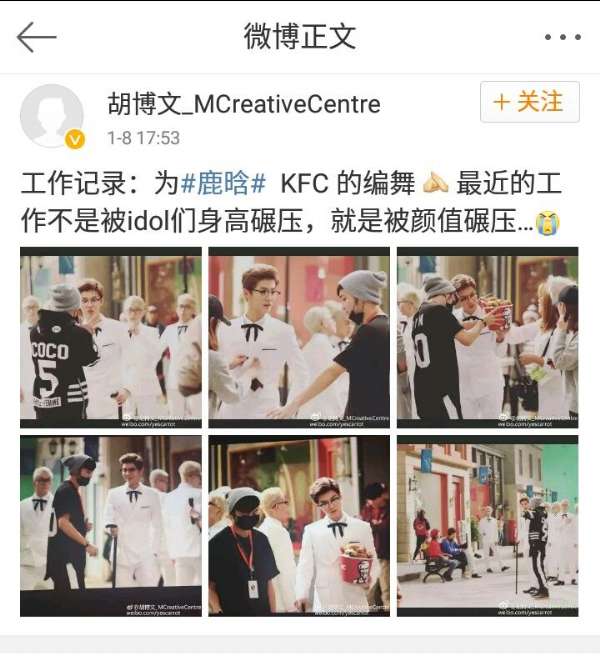 微博原文:“工作記錄:為#鹿晗# KFC 的編舞 [作揖] 最近的工作不是被idol們身高碾壓,就是被顏值碾壓…[淚]”