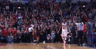最神奇的是,在第四節(jié)最后42秒,巴特勒12尺跳投不中,但是他神奇地?fù)屜铝岁P(guān)鍵的前場(chǎng)籃板,然后回傳給外線的韋德,韋德又傳給了右側(cè)45度埋伏的邁克德莫特,后者命中27尺外的三分,將比分反超為107-105,這一球也是公牛進(jìn)入加時(shí)賽的保證。