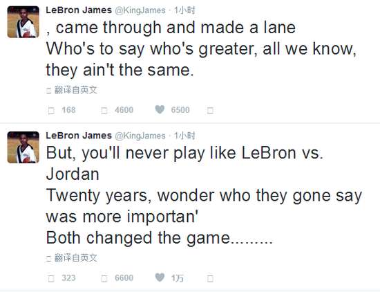 “但是,你們永遠(yuǎn)看不到勒布朗和喬丹對決的場面。20年后,很想知道他們會認(rèn)為誰更加重要。兩個人(喬丹和詹姆斯)都改變了比賽,經(jīng)歷了許多之后取得成功,并且走出了一條道路。誰能說他倆之間誰更加偉大,我們所知道的是,他們不是同一類型的球員。”詹姆斯在推特上這樣寫道。