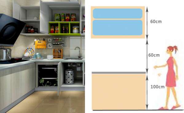 從操作臺(tái)到吊柜的底部,確保有60cm!這樣方便烹飪,還可以在吊柜里放一些小型家用電器。