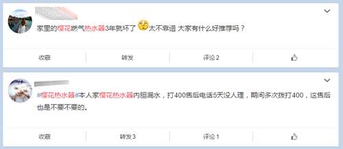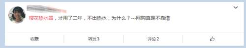 有位名叫“我就是我”的網友在網絡上留言稱,他家已經買了櫻花衛(wèi)廚的熱水器九年了,櫻花衛(wèi)廚真是垃圾!九年來家里修熱水器維修次數數都數不清,一次五百,一年最起碼兩到三次,每年一到冬天都壞掉。這一次,他終于忍不住爆發(fā)了。在進入浴室以后衣服脫好了,等熱水,熱水器的打火石就壞了,不能出水。家里硬著頭皮修熱水器,但是怎么維修都維修不好。今天家里下雪了,同樣準備洗澡,然后熱水器又壞了,我就冷冷的從水里出來,等燒水,寒冷的冬天讓這個人哆哆嗦嗦,而不作為的維修才真正讓消費者心寒。據悉,這款熱水器在在一家名為“五星”的點買的,之后不知道什么原因就搬到什么地方去了。多次叫維修上門維修修不好,可想而知這位消費者心情有多煩躁。另一位網友表示,櫻花熱水器才用2年,就不出熱水,為什么?還有一位網友也稱家里的櫻花熱水器3年就壞了,太不靠譜!