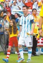 梅西牽著小美女入場。