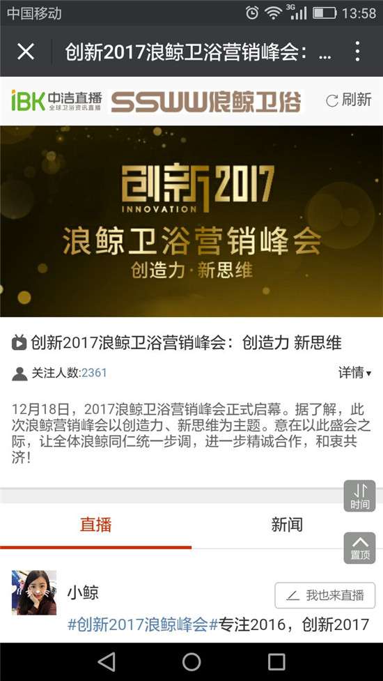 考慮到大家的手機(jī)流量珍貴,會(huì)議現(xiàn)場(chǎng)還有很多的亮點(diǎn)沒(méi)來(lái)得及給大家分享,不過(guò)我們?cè)跔I(yíng)銷峰會(huì)期間及時(shí)跟新報(bào)道現(xiàn)場(chǎng)信息,讓大家能關(guān)注到更多浪鯨衛(wèi)浴“創(chuàng)新·2017”營(yíng)銷峰會(huì)的最新消息。