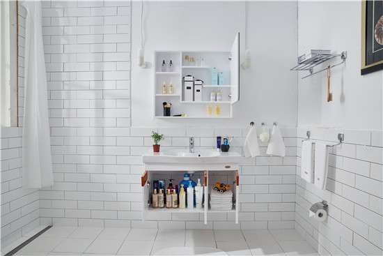 這款浴室柜的特別之處在于,它在保證外觀簡潔的前提上,不僅有開放式的置物架擺放洗發(fā)水、漱口杯等常用品,還巧妙地利用鏡子作為柜門,設計了封閉的空間用于收納容易受潮的物件,充分利用空間的同時,也顯得十分人性化。