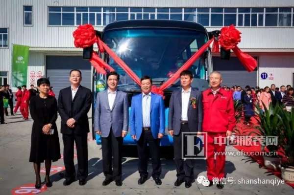 鄭永剛參加青杉汽車首臺(tái)車下線儀式,與下線的第一輛客車合影。