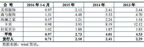 數(shù)據(jù)顯示,太平鳥門店總數(shù)由2013年年初增長至2016年6月末的4017家,其中2015年末共3794家。同行業(yè)上市公司美邦服飾2015年門店共3700多家,森馬服飾2015年門店共3477家,海瀾之家2015年門店共3990家,卡賓2015年門店共1139家,拉夏貝爾2015年門店共7,893家。