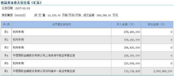 中新經(jīng)緯客戶端1月18日電 據(jù)深交所18日披露的大宗交易信息,美的集團1月18日現(xiàn)28.93億元天量大宗交易,賣方席位全部來自中金公司深圳福華一路證券營業(yè)部。買方則多為機構專用席位。