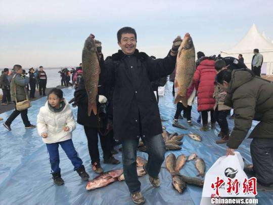 眾人期待已久的捕魚開始了:破冰、下網(wǎng)、打眼、走桿、拉網(wǎng)……緩緩拉出的魚網(wǎng)把整個(gè)冬捕活動(dòng)推向了高潮。剛出網(wǎng)的鯉魚、鰱魚、鯽魚、草魚等活蹦亂跳,不少游客按捺不住激動(dòng)紛紛掏出手機(jī)同魚合影,更多人則是拿起袋子選購心儀的那一尾魚。