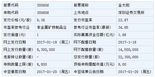 第一黃金網(wǎng)1月18日訊:據(jù)第一黃金網(wǎng)掌握的最新消息,今日周三(1月18日) 金太陽(yáng)新股發(fā)行申購(gòu)。金太陽(yáng)此次發(fā)行總數(shù)為2230萬(wàn)股,網(wǎng)上發(fā)行830萬(wàn)股,發(fā)行市盈率22.97倍,申購(gòu)代碼:300606,申購(gòu)價(jià)格:8.36元,單一帳戶申購(gòu)上限8000股,申購(gòu)數(shù)量500股整數(shù)倍。