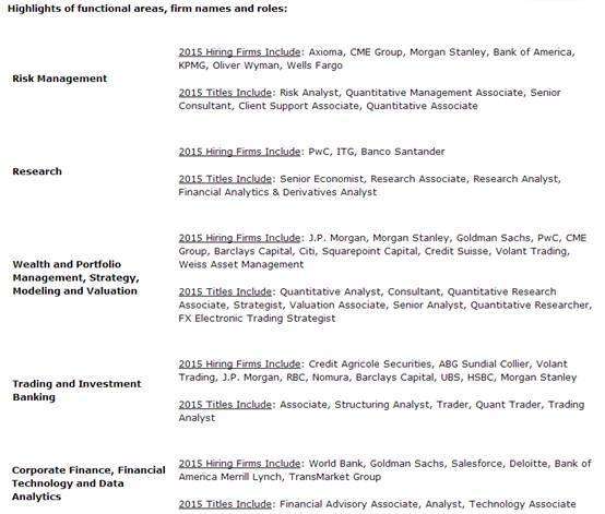 2.最新15級學(xué)生的就業(yè)率是100%,其中從事財(cái)富與投資組合管理,戰(zhàn)略,建模與估值方面工作的占到43%,72%以上學(xué)生均是在紐約找到工作,畢業(yè)生年薪在$60,000- $130,000之間。