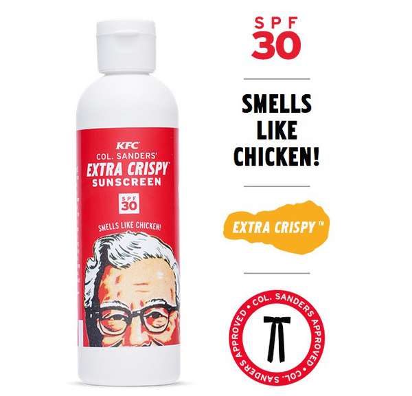 繼指甲油之后,肯德基繼續推出了炸雞防曬霜(KFC’s Extra Crispy Sunscreen SPF 30)。不同于本質是調味料的指甲油,這款防曬霜是防曬指數為SPF 30 的正經防曬產品,廣告標語也說「聞起來像雞肉,嘗起來像防曬霜」,所以千萬不要誤吃了……只是把它涂滿臉出門,會不會被人追著聞啊?
