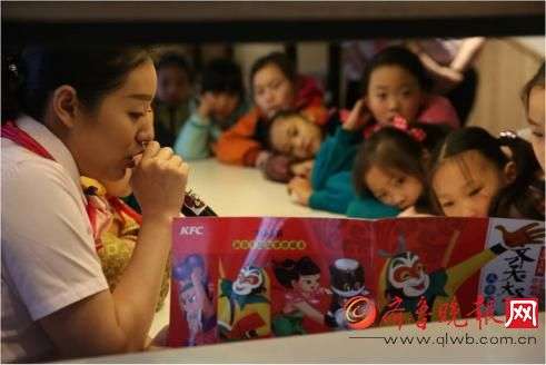 齊魯晚報01月19日訊:1月18日上午,上海滬太路上的一家肯德基餐廳里,年味兒十足:玻璃幕墻上貼著“春”和“福”的窗花,天花板上垂掛下數十個大大小小形式各異的紅色燈籠,連白色的筒燈上也掛上了雞年剪紙畫;餐桌上,一群孩子剛聽完《四寶鬧新春》的故事,又在故事姐姐的帶領下,DIY起了紅彤彤的新春燈籠。參加本次活動的兒童是外來務工人員子女,肯德基的新春故事會讓這些“小候鳥”們提前感受到新春佳節(jié)的熱鬧的氣氛。