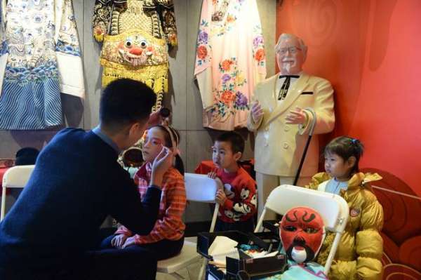 小朋友在肯德基餐廳體驗京劇勾臉