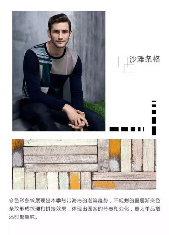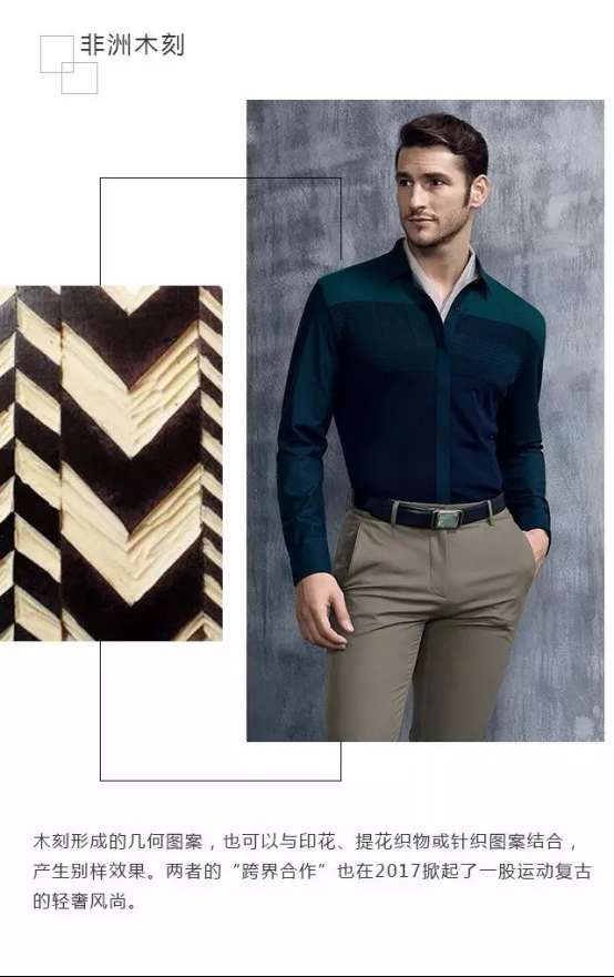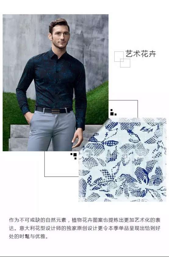 綠色生活方式的倡導,促使2017春夏商務休閑男裝的花型流行更加趨于自然,也推動了運動風和現代感發(fā)展成為簡約潮流,在這一季流行的花型元素中,隨處能捕捉到它們的存在。