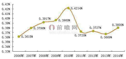 2006-2014年中國體育用品行業(yè)增加值占GDP比重(單位:%)