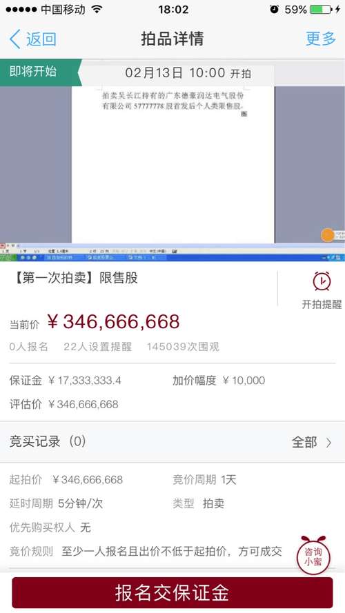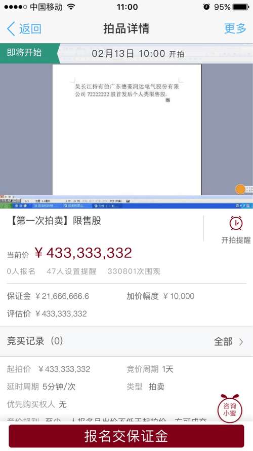 這批股權(quán)的拍賣時(shí)間為2月13日早上10時(shí)至2月14日早上10時(shí),如在截止時(shí)間仍有人叫價(jià),則后延5分鐘,直到無人加價(jià)超過5分鐘,則拍賣結(jié)束。不過記者了解到,截止到目前,這場(chǎng)社會(huì)關(guān)注的拍賣主角——競(jìng)拍者目前尚未露面。