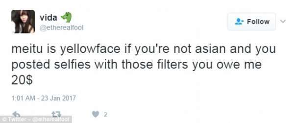Vida說:“美圖修的是黃臉,如果你不是亞洲人,你分享了那些過濾了的照片,你欠我20美元。”