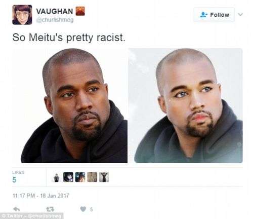 其他人使用后,認(rèn)為該應(yīng)用程序存在種族偏見,如網(wǎng)友Vaughn發(fā)布了用美圖修過的饒舌歌手Kanye West的照片,并配上標(biāo)題:所以美圖是真正的種族主義者。