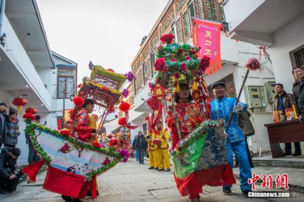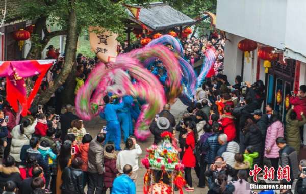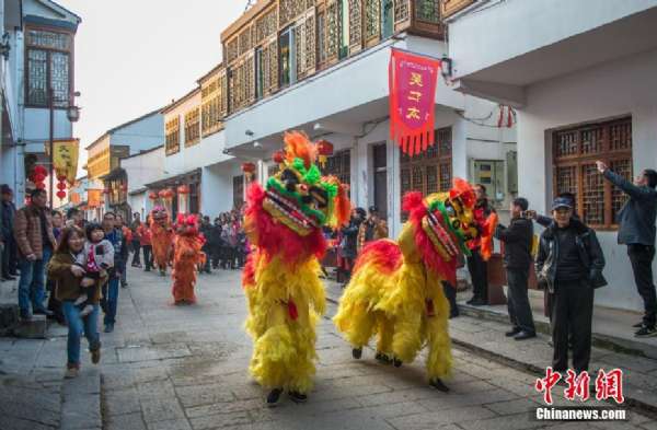 除夕佳節(1月27日),浙江省長興縣上泗安村舉行傳統民俗活動,舞青龍、百葉龍、十番鑼鼓、泗安旱船、花鼓戲、林城獅舞等表演形式吸引了上千名當地百姓和游客前來觀賞。每年除夕,上泗安村都會舞龍慶新年,寓意來年風調雨順,百姓安居樂業。吳拯 攝